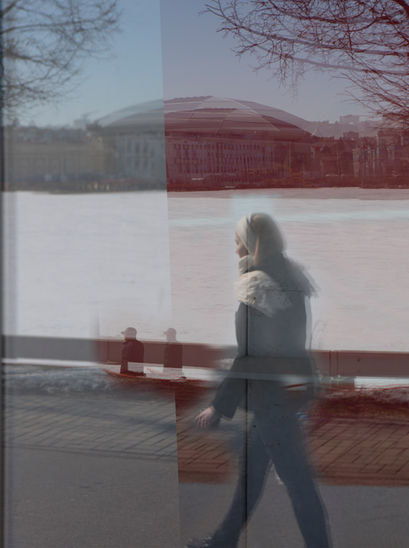 I shoot the reflection. I watch the way how it lives and changes, deliberately hiding from the view of the camera, around the corner and thereby erasing myself from the image where I must exist. I glue the reflection in a panorama, restoring the one whose intangible trace it is.